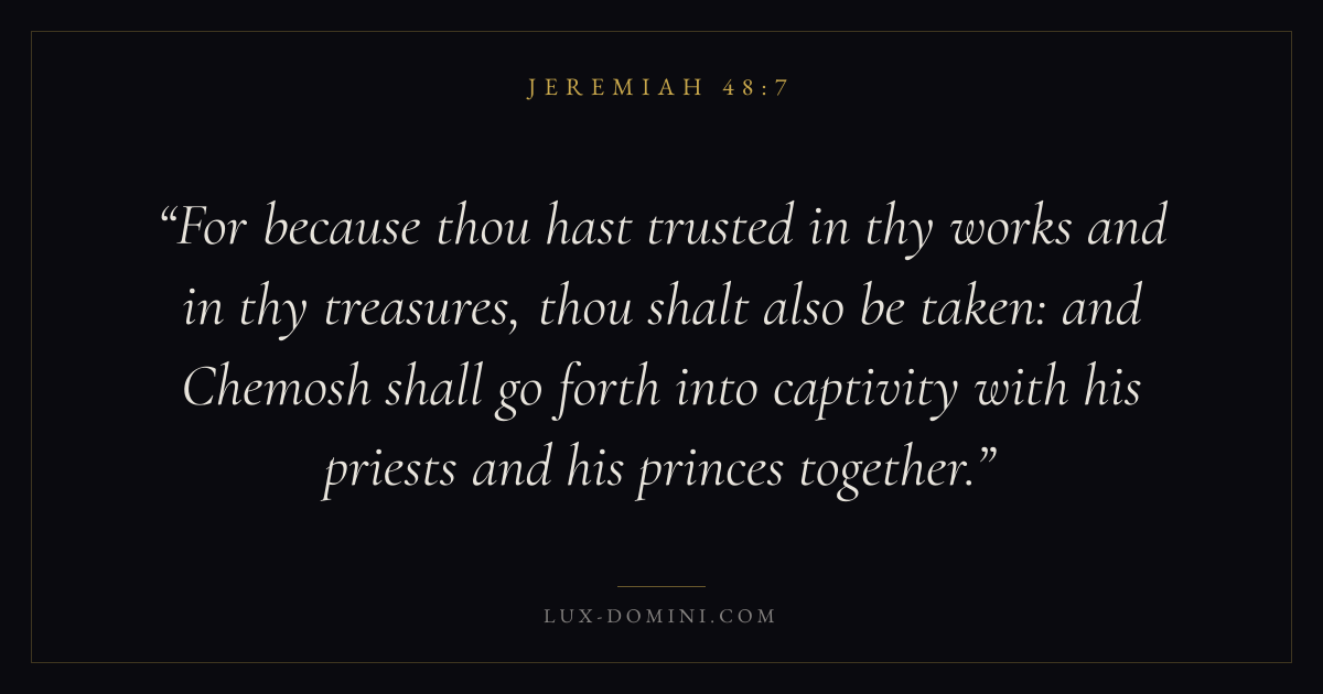 For because thou hast trusted in thy works and in thy treasures, thou shalt also be taken: and Chemosh shall go forth into captivity with his priests and his princes together.