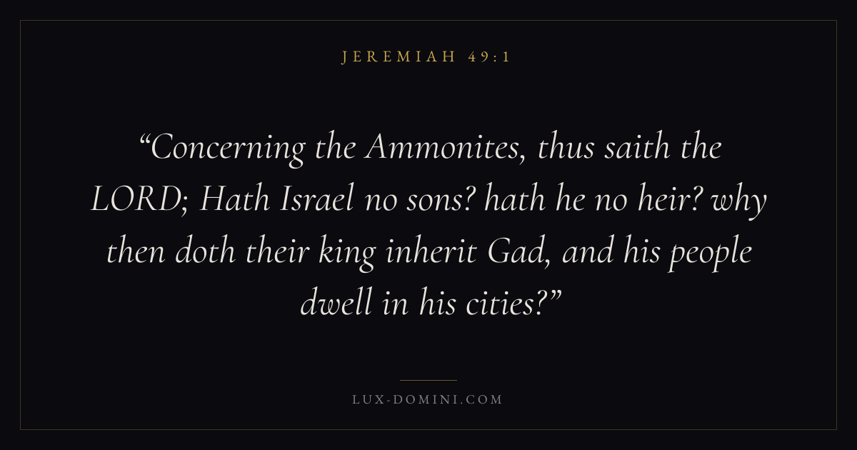 Concerning the Ammonites, thus saith the LORD; Hath Israel no sons? hath he no heir? why then doth their king inherit Gad, and his people dwell in his cities?