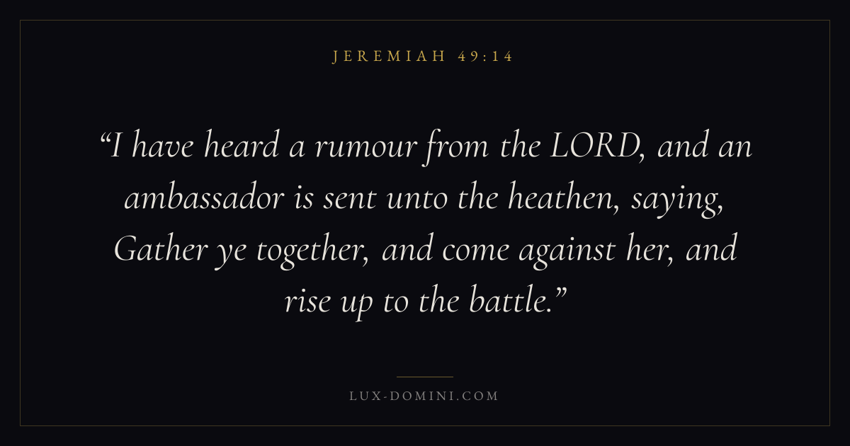 I have heard a rumour from the LORD, and an ambassador is sent unto the heathen, saying, Gather ye together, and come against her, and rise up to the battle.