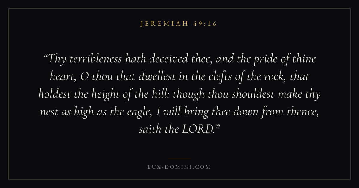 Thy terribleness hath deceived thee, and the pride of thine heart, O thou that dwellest in the clefts of the rock, that holdest the height of the hill: though thou shouldest make thy nest as high as the eagle, I will bring thee down from thence, saith the LORD.