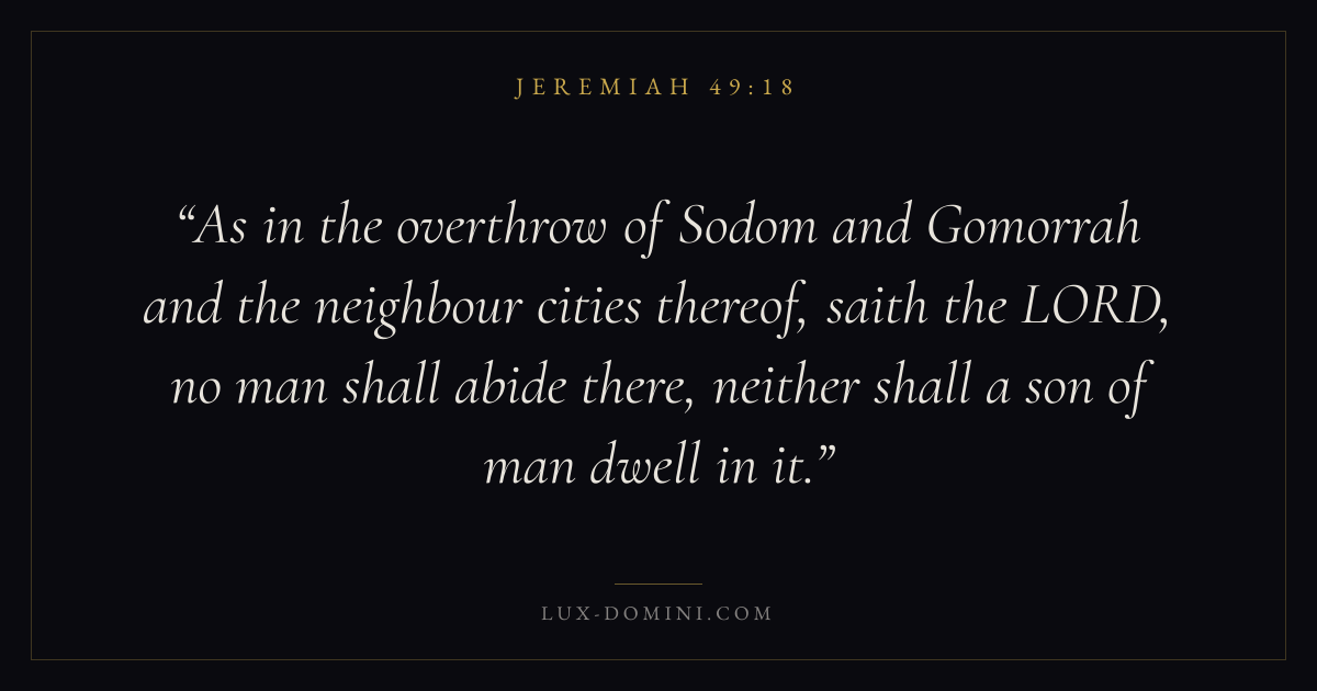 As in the overthrow of Sodom and Gomorrah and the neighbour cities thereof, saith the LORD, no man shall abide there, neither shall a son of man dwell in it.