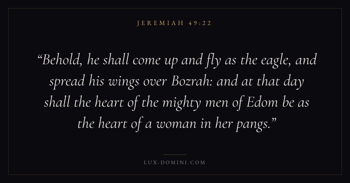 Behold, he shall come up and fly as the eagle, and spread his wings over Bozrah: and at that day shall the heart of the mighty men of Edom be as the heart of a woman in her pangs.