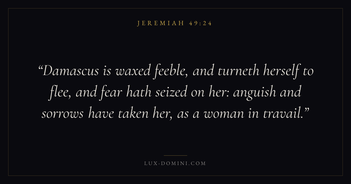 Damascus is waxed feeble, and turneth herself to flee, and fear hath seized on her: anguish and sorrows have taken her, as a woman in travail.