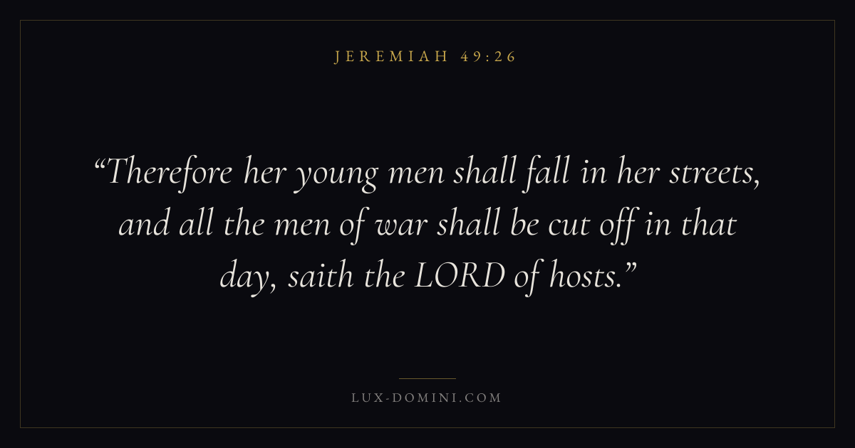 Therefore her young men shall fall in her streets, and all the men of war shall be cut off in that day, saith the LORD of hosts.
