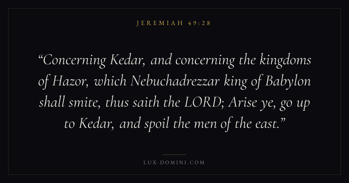 Concerning Kedar, and concerning the kingdoms of Hazor, which Nebuchadrezzar king of Babylon shall smite, thus saith the LORD; Arise ye, go up to Kedar, and spoil the men of the east.