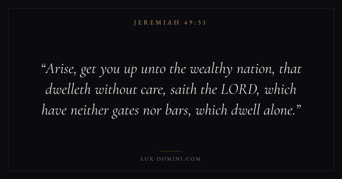 Arise, get you up unto the wealthy nation, that dwelleth without care, saith the LORD, which have neither gates nor bars, which dwell alone.