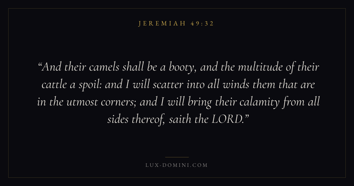 And their camels shall be a booty, and the multitude of their cattle a spoil: and I will scatter into all winds them that are in the utmost corners; and I will bring their calamity from all sides thereof, saith the LORD.