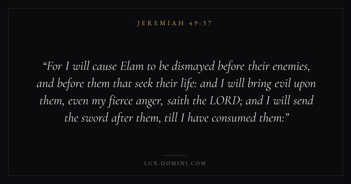 For I will cause Elam to be dismayed before their enemies, and before them that seek their life: and I will bring evil upon them, even my fierce anger, saith the LORD; and I will send the sword after them, till I have consumed them: