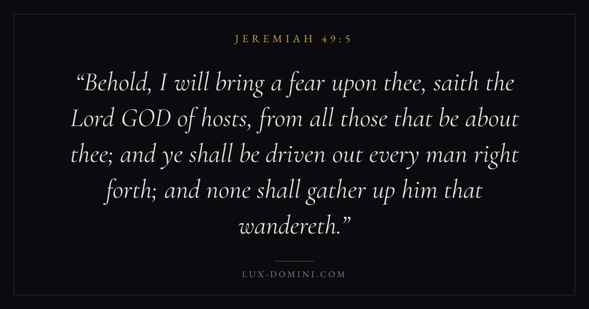 Behold, I will bring a fear upon thee, saith the Lord GOD of hosts, from all those that be about thee; and ye shall be driven out every man right forth; and none shall gather up him that wandereth.