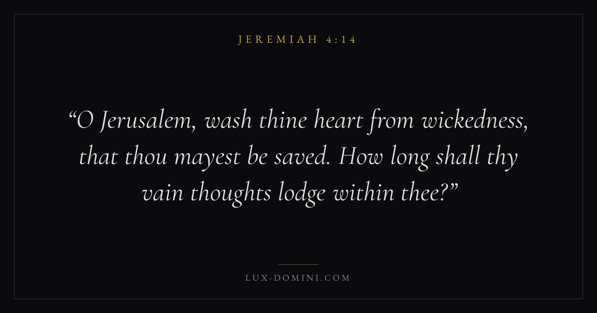 O Jerusalem, wash thine heart from wickedness, that thou mayest be saved. How long shall thy vain thoughts lodge within thee?