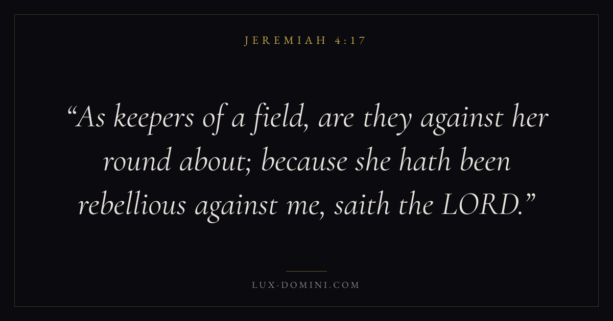 As keepers of a field, are they against her round about; because she hath been rebellious against me, saith the LORD.