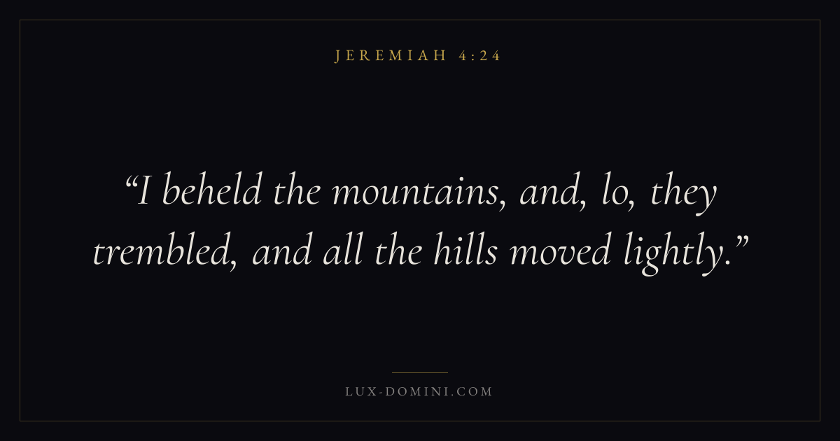 Books / Jeremiah / Chapter 4 / Verse 24 ← Jeremiah 4:23 Jeremiah 4:24 Jeremiah 4:25 → I beheld the mountains, and, lo, they trembled, and all the hills moved lightly. Download verse card Share on Twitter Share on Facebook Pin it ✦ Key themes HopeSuffering and trialsJustice and mercyJudgment Read with Jeremiah 4:23Jeremiah 4:25Romans 8:24Revelation 21:4 Related topics Bible verses about hopeBible verses about suffering and trialsBible verses about justice and mercy ✦ Jeremiah Chapter 4 verses V. 1 V. 2 V. 3 V. 4 V. 5 V. 6 V. 7 V. 8 V. 9 V. 10 V. 11 V. 12 V. 13 V. 14 V. 15 V. 16 V. 17 V. 18 V. 19 V. 20 V. 21 V. 22 V. 23 V. 24 V. 25 V. 26 V. 27 V. 28 V. 29 V. 30 V. 31