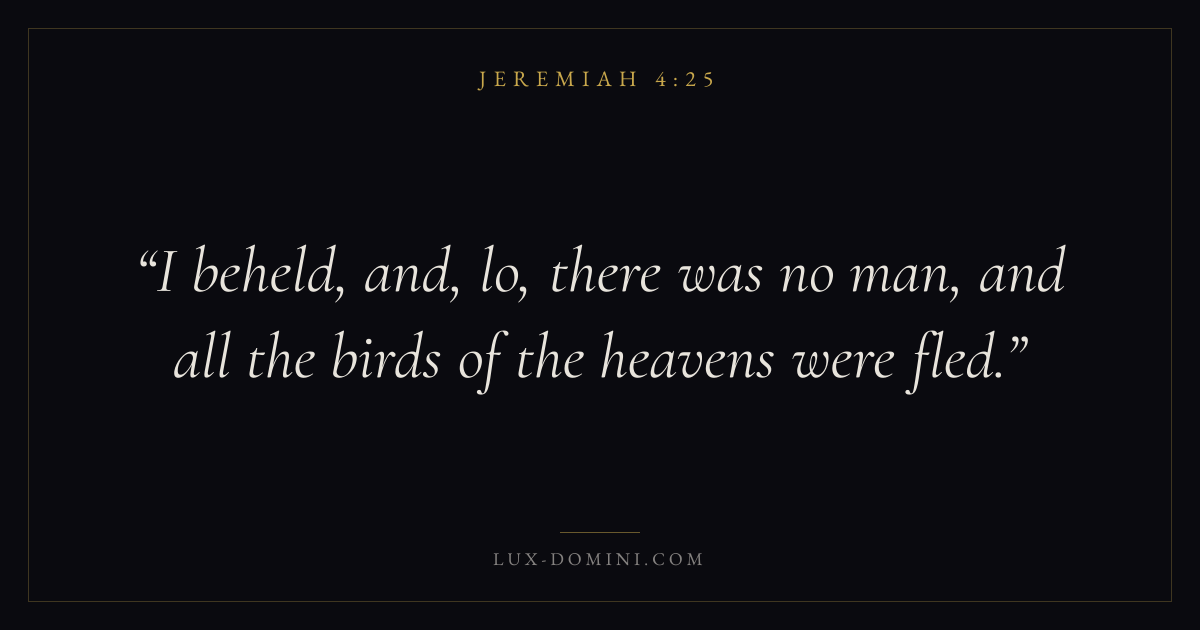 Books / Jeremiah / Chapter 4 / Verse 25 ← Jeremiah 4:24 Jeremiah 4:25 Jeremiah 4:26 → I beheld, and, lo, there was no man, and all the birds of the heavens were fled. Download verse card Share on Twitter Share on Facebook Pin it ✦ Key themes HopeSuffering and trialsJustice and mercyJudgment Read with Jeremiah 4:23Jeremiah 4:24Romans 8:24Revelation 21:4 Related topics Bible verses about hopeBible verses about suffering and trialsBible verses about justice and mercy ✦ Jeremiah Chapter 4 verses V. 1 V. 2 V. 3 V. 4 V. 5 V. 6 V. 7 V. 8 V. 9 V. 10 V. 11 V. 12 V. 13 V. 14 V. 15 V. 16 V. 17 V. 18 V. 19 V. 20 V. 21 V. 22 V. 23 V. 24 V. 25 V. 26 V. 27 V. 28 V. 29 V. 30 V. 31