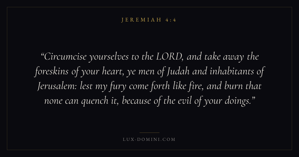 Circumcise yourselves to the LORD, and take away the foreskins of your heart, ye men of Judah and inhabitants of Jerusalem: lest my fury come forth like fire, and burn that none can quench it, because of the evil of your doings.