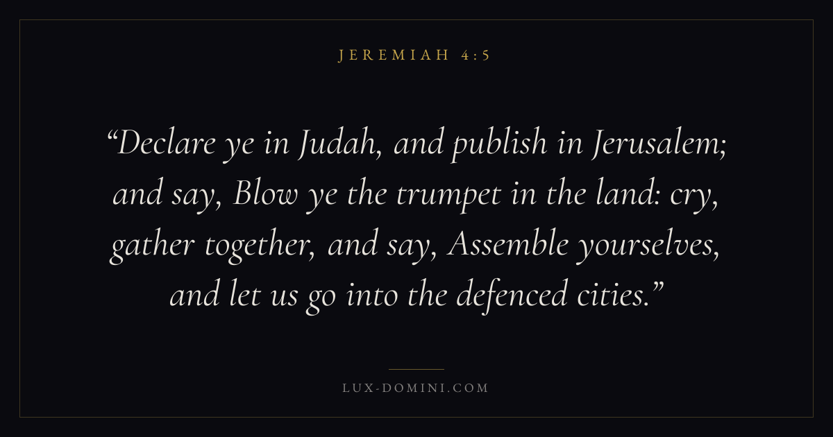 Declare ye in Judah, and publish in Jerusalem; and say, Blow ye the trumpet in the land: cry, gather together, and say, Assemble yourselves, and let us go into the defenced cities.