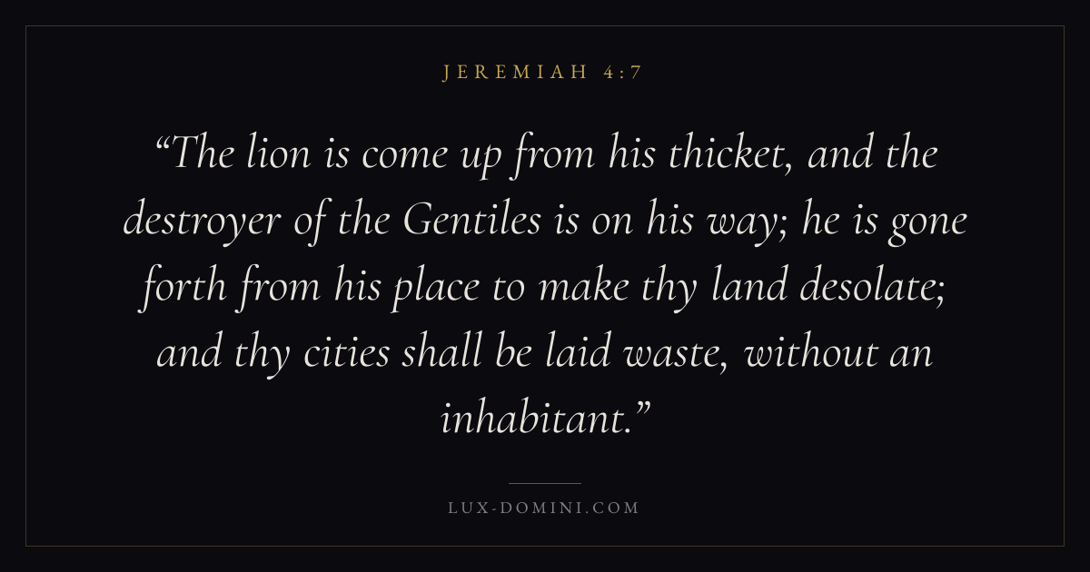 The lion is come up from his thicket, and the destroyer of the Gentiles is on his way; he is gone forth from his place to make thy land desolate; and thy cities shall be laid waste, without an inhabitant.