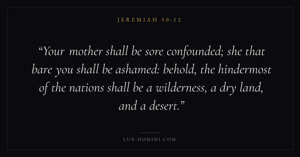 Your mother shall be sore confounded; she that bare you shall be ashamed: behold, the hindermost of the nations shall be a wilderness, a dry land, and a desert.