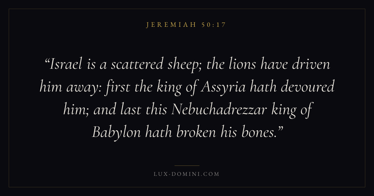 Israel is a scattered sheep; the lions have driven him away: first the king of Assyria hath devoured him; and last this Nebuchadrezzar king of Babylon hath broken his bones.