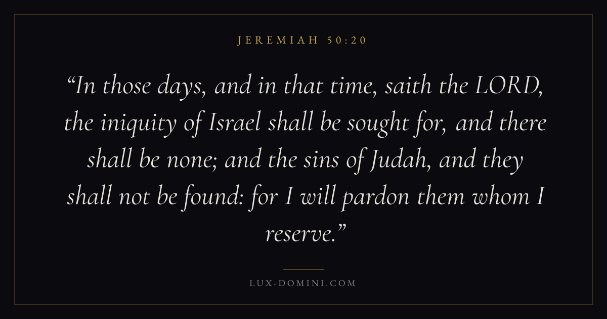 In those days, and in that time, saith the LORD, the iniquity of Israel shall be sought for, and there shall be none; and the sins of Judah, and they shall not be found: for I will pardon them whom I reserve.