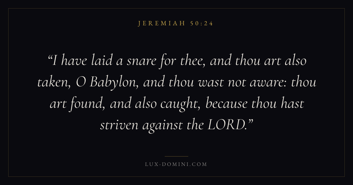I have laid a snare for thee, and thou art also taken, O Babylon, and thou wast not aware: thou art found, and also caught, because thou hast striven against the LORD.