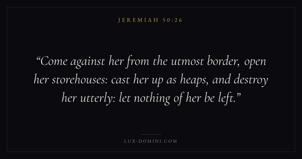 Come against her from the utmost border, open her storehouses: cast her up as heaps, and destroy her utterly: let nothing of her be left.