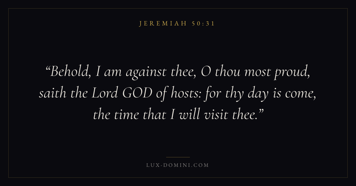 Behold, I am against thee, O thou most proud, saith the Lord GOD of hosts: for thy day is come, the time that I will visit thee.