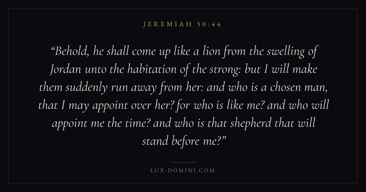 Behold, he shall come up like a lion from the swelling of Jordan unto the habitation of the strong: but I will make them suddenly run away from her: and who is a chosen man, that I may appoint over her? for who is like me? and who will appoint me the time? and who is that shepherd that will stand before me?
