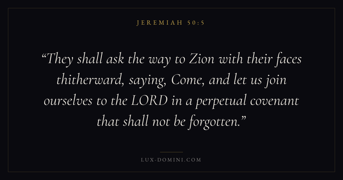 They shall ask the way to Zion with their faces thitherward, saying, Come, and let us join ourselves to the LORD in a perpetual covenant that shall not be forgotten.