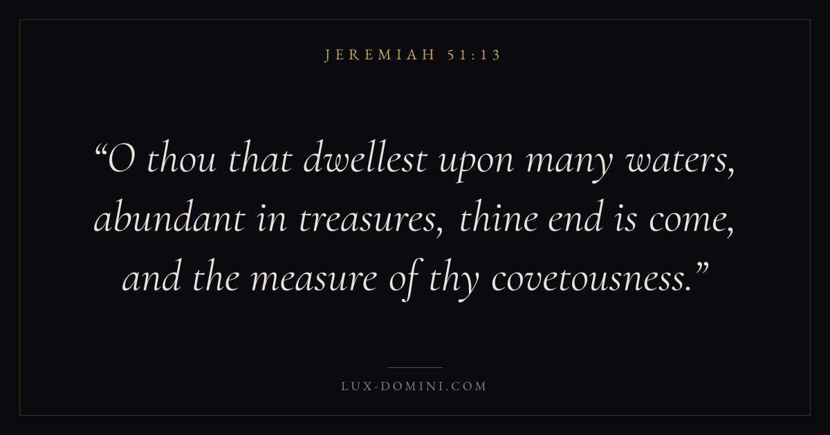 O thou that dwellest upon many waters, abundant in treasures, thine end is come, and the measure of thy covetousness.