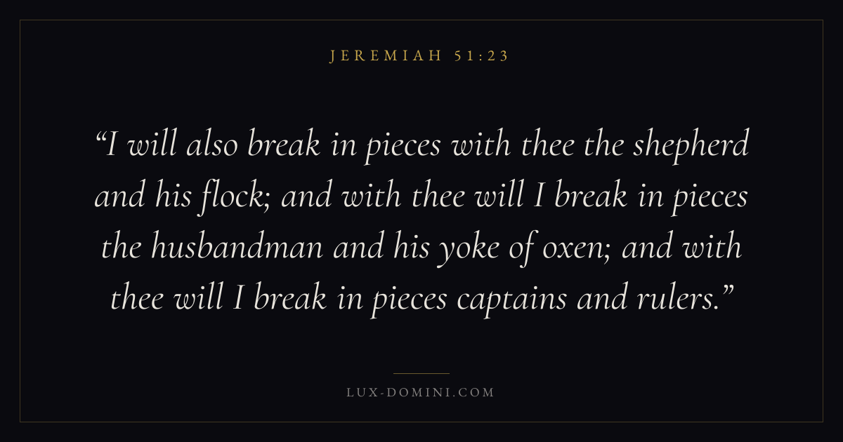 I will also break in pieces with thee the shepherd and his flock; and with thee will I break in pieces the husbandman and his yoke of oxen; and with thee will I break in pieces captains and rulers.