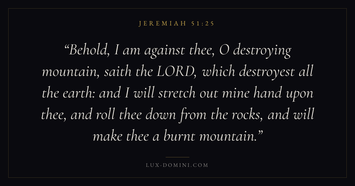 Behold, I am against thee, O destroying mountain, saith the LORD, which destroyest all the earth: and I will stretch out mine hand upon thee, and roll thee down from the rocks, and will make thee a burnt mountain.