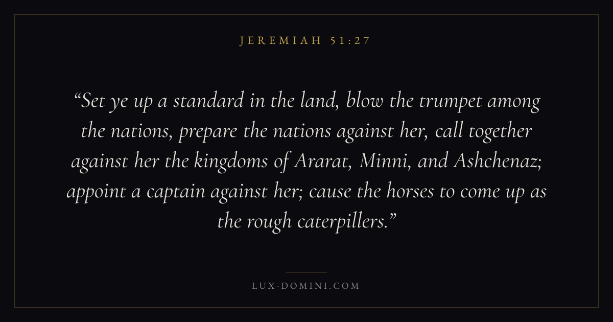 Set ye up a standard in the land, blow the trumpet among the nations, prepare the nations against her, call together against her the kingdoms of Ararat, Minni, and Ashchenaz; appoint a captain against her; cause the horses to come up as the rough caterpillers.