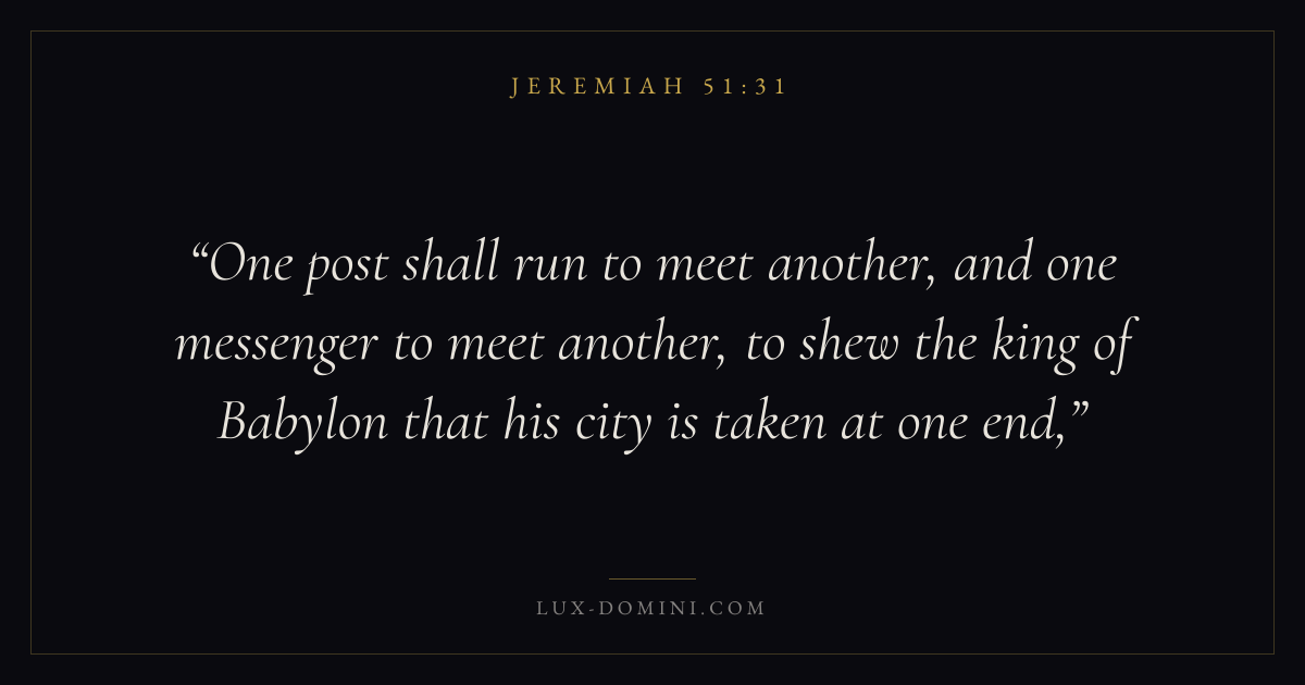 One post shall run to meet another, and one messenger to meet another, to shew the king of Babylon that his city is taken at one end,