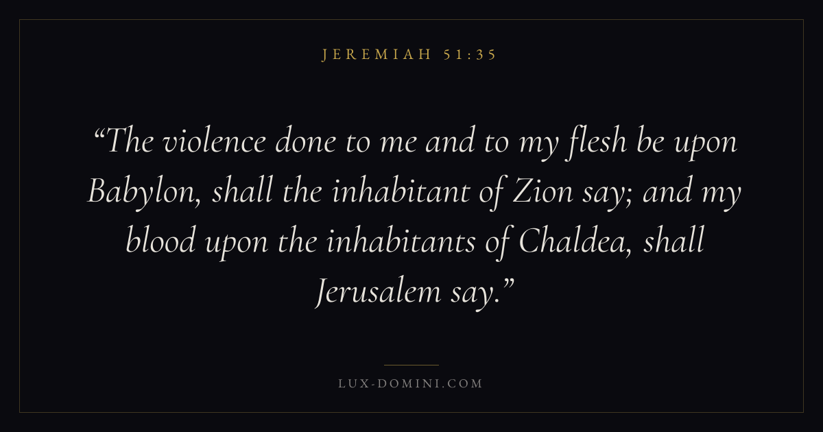 The violence done to me and to my flesh be upon Babylon, shall the inhabitant of Zion say; and my blood upon the inhabitants of Chaldea, shall Jerusalem say.