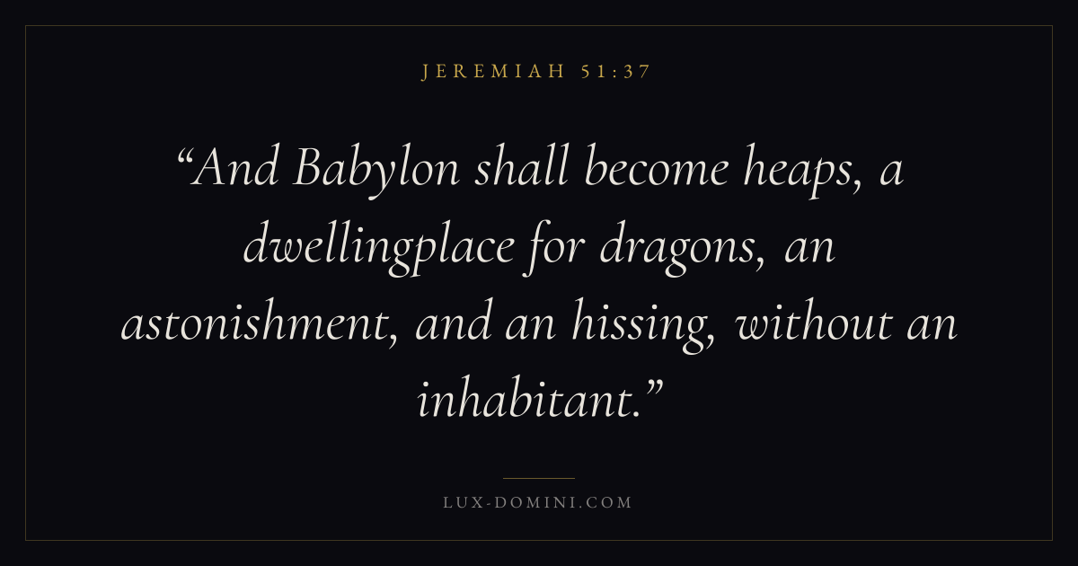 And Babylon shall become heaps, a dwellingplace for dragons, an astonishment, and an hissing, without an inhabitant.