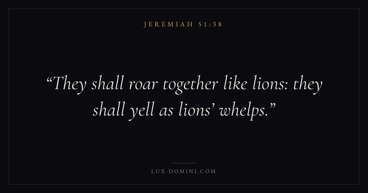 Books / Jeremiah / Chapter 51 / Verse 38 ← Jeremiah 51:37 Jeremiah 51:38 Jeremiah 51:39 → They shall roar together like lions: they shall yell as lions’ whelps. Download verse card Share on Twitter Share on Facebook Pin it ✦ Key themes HopeSuffering and trialsJustice and mercyJudgment Read with Jeremiah 51:39Romans 8:24Revelation 21:4Romans 8:18 Related topics Bible verses about hopeBible verses about suffering and trialsBible verses about justice and mercy ✦ Jeremiah Chapter 51 verses V. 1 V. 2 V. 3 V. 4 V. 5 V. 6 V. 7 V. 8 V. 9 V. 10 V. 11 V. 12 V. 13 V. 14 V. 15 V. 16 V. 17 V. 18 V. 19 V. 20 V. 21 V. 22 V. 23 V. 24 V. 25 V. 26 V. 27 V. 28 V. 29 V. 30 V. 31 V. 32 V. 33 V. 34 V. 35 V. 36 V. 37 V. 38 V. 39 V. 40 V. 41 V. 42 V. 43 V. 44 V. 45 V. 46 V. 47 V. 48 V. 49 V. 50 V. 51 V. 52 V. 53 V. 54 V. 55 V. 56 V. 57 V. 58 V. 59 V. 60 V. 61 V. 62 V. 63 V. 64
