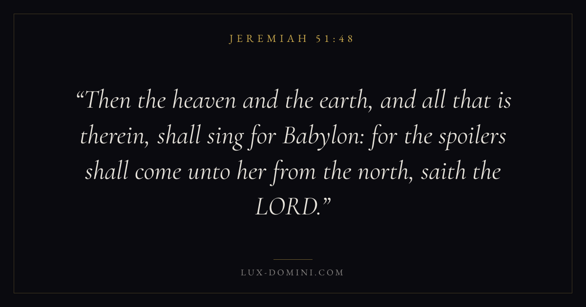 Then the heaven and the earth, and all that is therein, shall sing for Babylon: for the spoilers shall come unto her from the north, saith the LORD.
