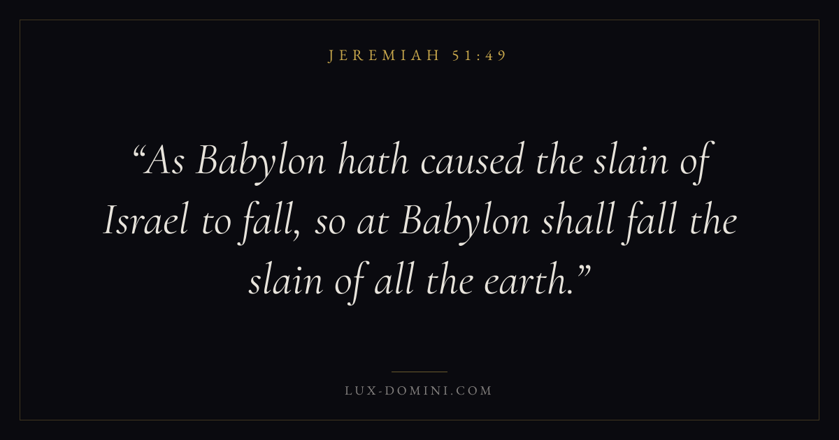 As Babylon hath caused the slain of Israel to fall, so at Babylon shall fall the slain of all the earth.