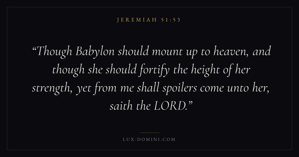 Though Babylon should mount up to heaven, and though she should fortify the height of her strength, yet from me shall spoilers come unto her, saith the LORD.