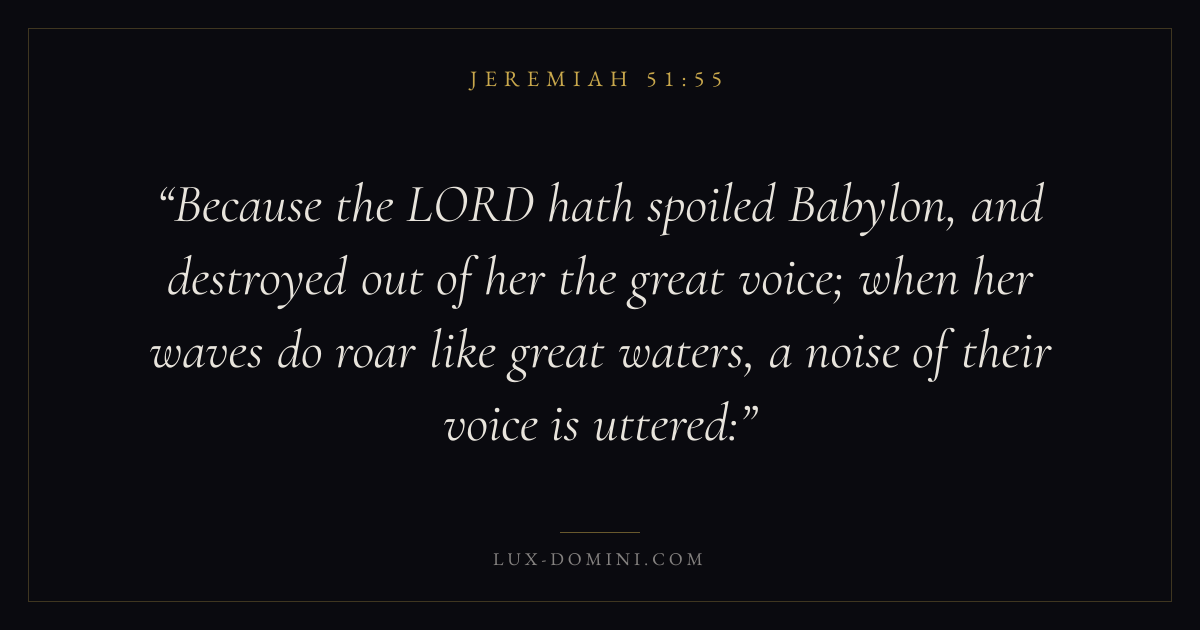 Because the LORD hath spoiled Babylon, and destroyed out of her the great voice; when her waves do roar like great waters, a noise of their voice is uttered: