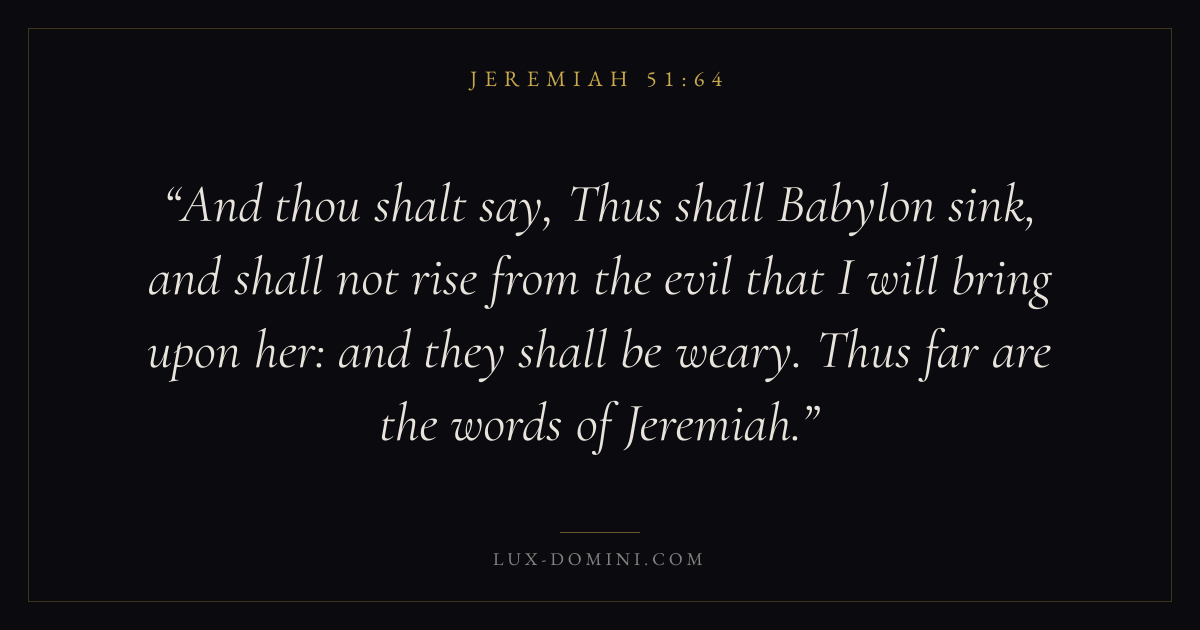 And thou shalt say, Thus shall Babylon sink, and shall not rise from the evil that I will bring upon her: and they shall be weary. Thus far are the words of Jeremiah.