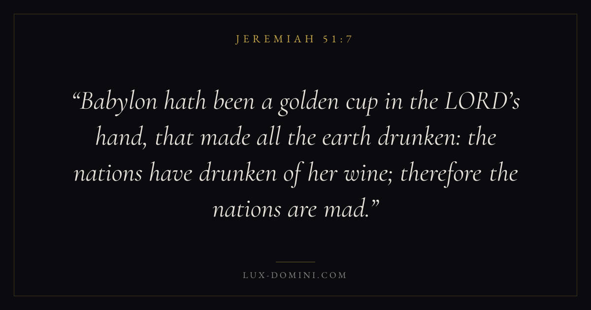 Babylon hath been a golden cup in the LORD’s hand, that made all the earth drunken: the nations have drunken of her wine; therefore the nations are mad.