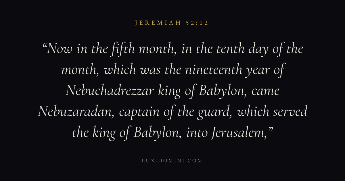 Now in the fifth month, in the tenth day of the month, which was the nineteenth year of Nebuchadrezzar king of Babylon, came Nebuzaradan, captain of the guard, which served the king of Babylon, into Jerusalem,