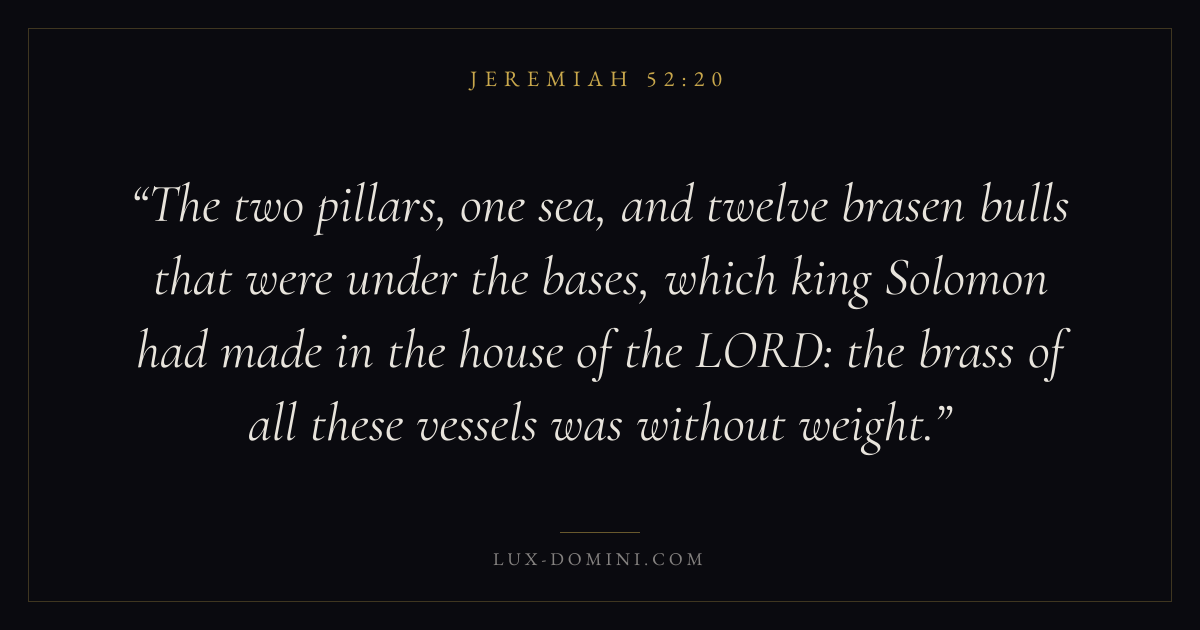 The two pillars, one sea, and twelve brasen bulls that were under the bases, which king Solomon had made in the house of the LORD: the brass of all these vessels was without weight.