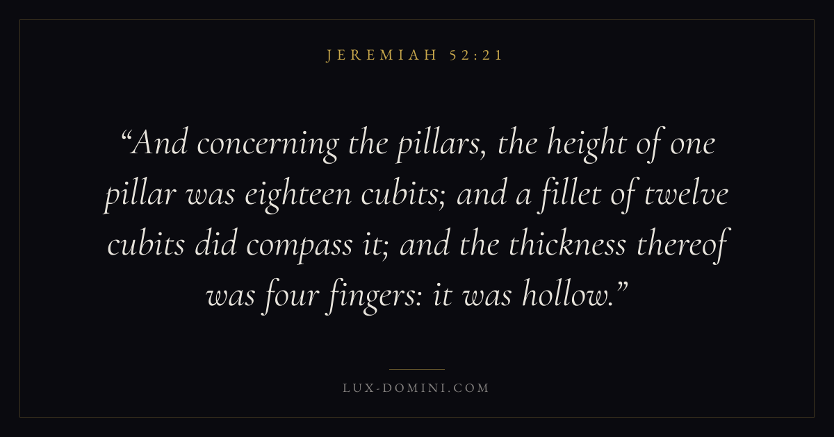 And concerning the pillars, the height of one pillar was eighteen cubits; and a fillet of twelve cubits did compass it; and the thickness thereof was four fingers: it was hollow.