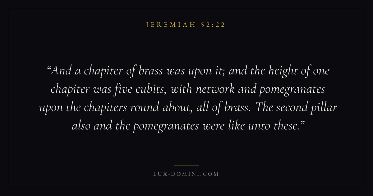 And a chapiter of brass was upon it; and the height of one chapiter was five cubits, with network and pomegranates upon the chapiters round about, all of brass. The second pillar also and the pomegranates were like unto these.