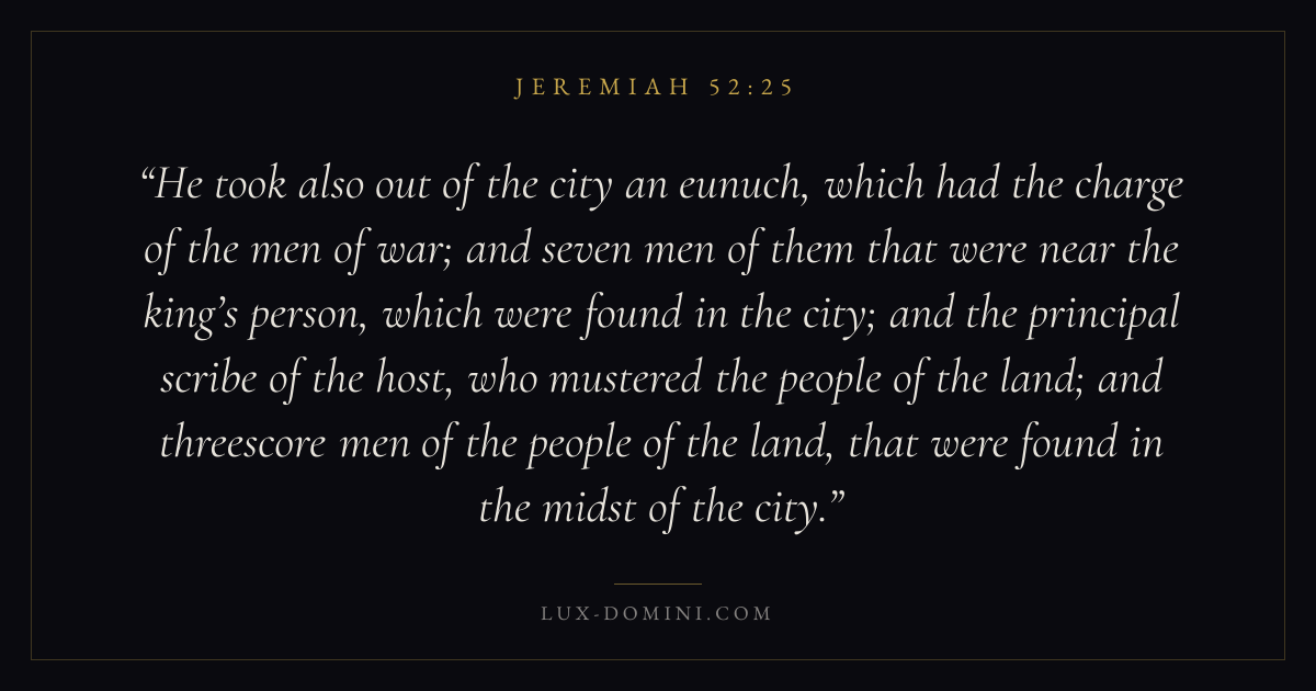 He took also out of the city an eunuch, which had the charge of the men of war; and seven men of them that were near the king’s person, which were found in the city; and the principal scribe of the host, who mustered the people of the land; and threescore men of the people of the land, that were found in the midst of the city.