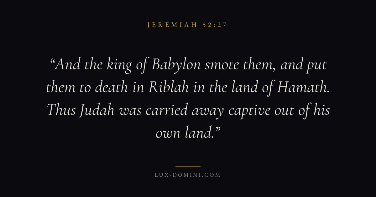 And the king of Babylon smote them, and put them to death in Riblah in the land of Hamath. Thus Judah was carried away captive out of his own land.