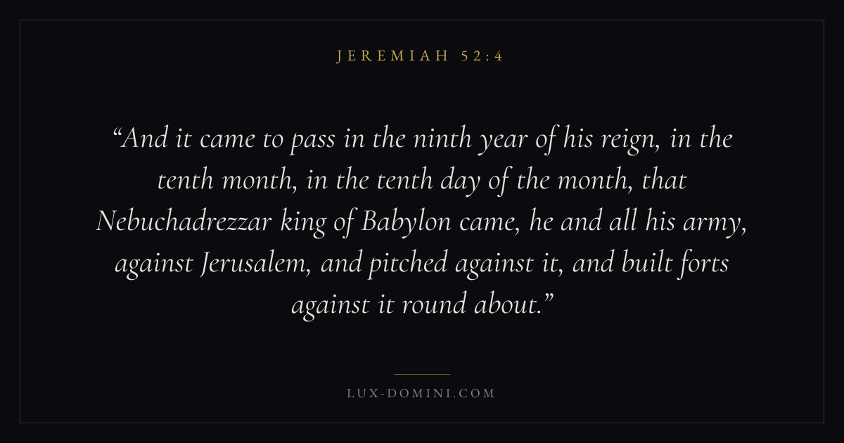 And it came to pass in the ninth year of his reign, in the tenth month, in the tenth day of the month, that Nebuchadrezzar king of Babylon came, he and all his army, against Jerusalem, and pitched against it, and built forts against it round about.