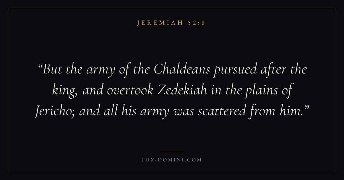 But the army of the Chaldeans pursued after the king, and overtook Zedekiah in the plains of Jericho; and all his army was scattered from him.